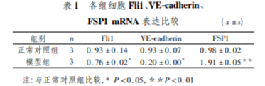 Fli1、VE-cadherin、FSP1 mRNA 表 達(dá)比較 TGF-β1 誘導(dǎo) HUVEC 細(xì)胞后,QPCR 法檢 測 Fli1、VE-cadherin、FSP1 的表達(dá),發(fā)現(xiàn)模型組內(nèi)皮 標(biāo)志物 VE-cadherin 表達(dá)降低( P < 0. 01) ,間質(zhì)標(biāo)志 FSP1 表達(dá)升高( P < 0. 01) ,提示 TGF-β1 誘導(dǎo)內(nèi)皮 間質(zhì)轉(zhuǎn)化模型建模成功; 同時模型組 Fli1 表達(dá)低于 對照組( P < 0. 05) 。見表 1。
