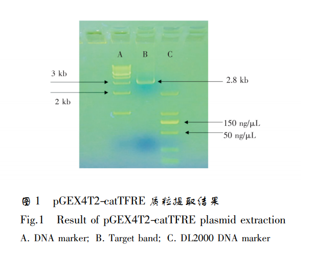 pGEX4T2-catTFRE 的提取 catTFRE 序列根據(jù)高等脊椎動物轉(zhuǎn)錄因子庫設(shè)計 ( http: / /jaspar.genereg.net /) ,將其鏈接到 pGEX4T2 載體上,得到全長為 2.8 kb 的重組質(zhì)粒。將 1 μL pGEX4T2-catTFRE 質(zhì)粒加入到 50 μL TOP10 感受態(tài)細胞中,經(jīng)熱激、復(fù)蘇后涂布于氨芐抗性 LuriaBertani 平板,37℃ 培養(yǎng)過夜,取單菌落接種于 2 mL Luria-Bertani 培養(yǎng)液,培養(yǎng) 6 h,按 1 ∶ 100 接種至 50 mL 培養(yǎng)基,培養(yǎng) 18 h,按試劑盒說明提取質(zhì)粒。