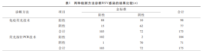 (表1) 175例呼吸道感染患兒中RSV感染陽性103例,其 中男64例,占比62.14%,女39例,占比37.86%。免 疫熒光技術(shù)檢測診斷患兒RSV感染陽性98例,其 中真陽性88例,熒光探針PCR技術(shù)檢測診斷患兒 RSV感染陽性104例,其中真陽性102例。